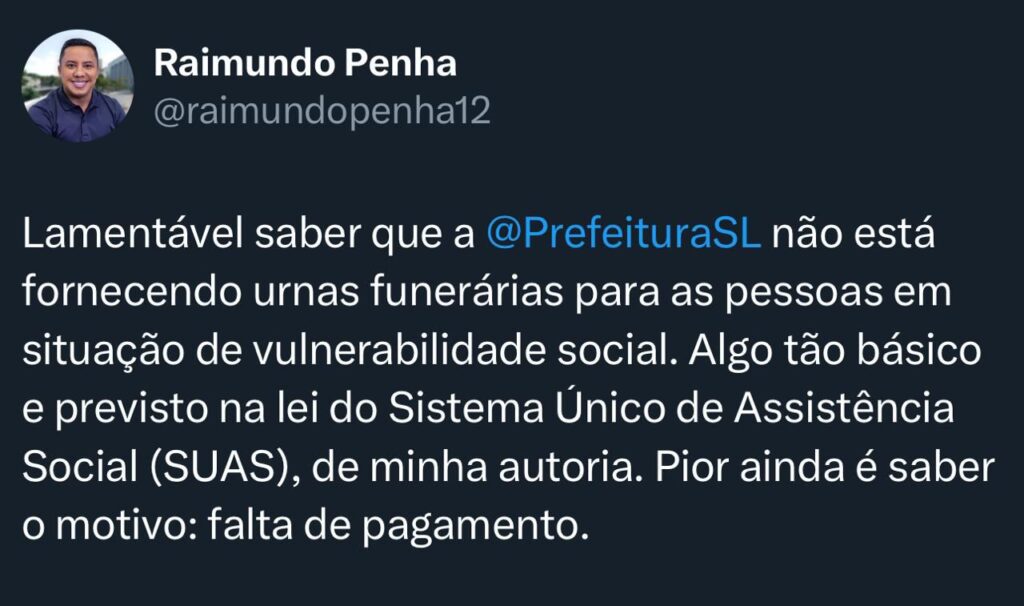 Penha cobra da Prefeitura de São Luís fornecimento de urnas funerárias
