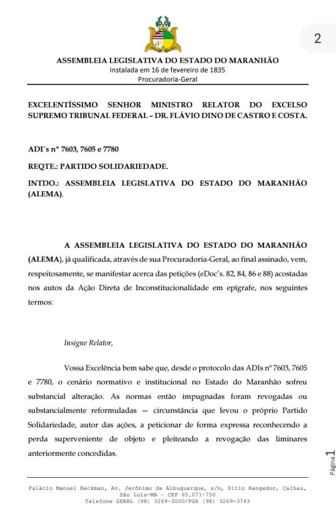 Assembleia Legislativa protocola nova petição no STF sobre escolha de conselheiros do TCE/MA