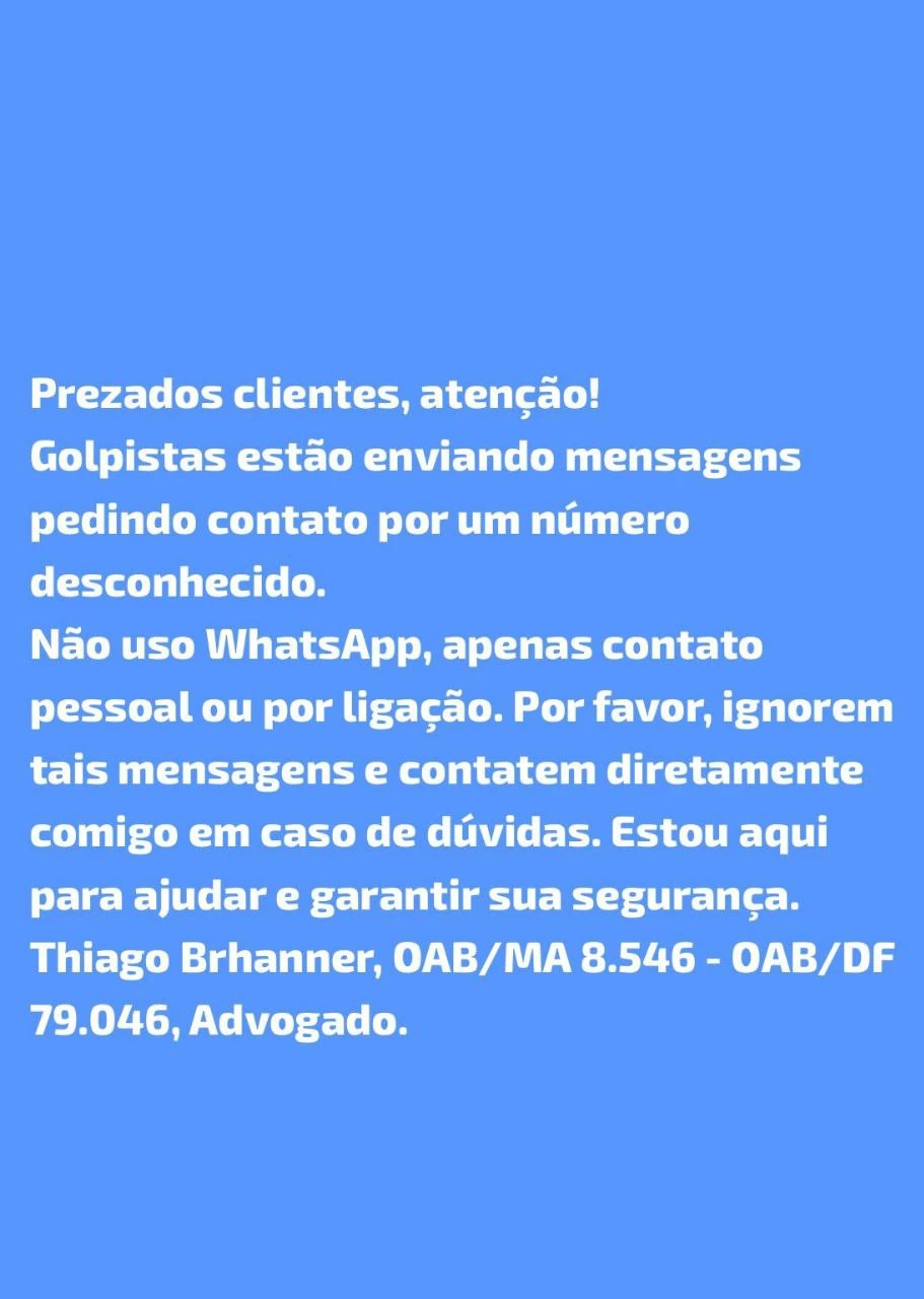 SÃO LUÍS – Clientes do advogado Thiago Brhanner, atuante no Maranhão, tornaram-se alvos de uma nova modalidade de golpe via WhatsApp nesta semana. Os golpistas estão utilizando o nome do advogado para enviar mensagens fraudulentas, alegando urgência no contato para tratar de processos judiciais em fase de liberação.