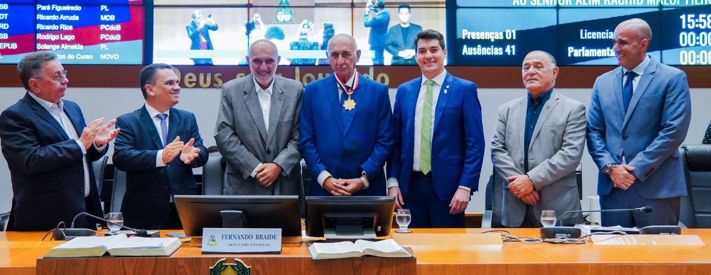A Assembleia Legislativa do Maranhão realizou, nesta terça-feira (8), Sessão Solene para entrega da Medalha do Mérito Legislativo “Manuel Beckman” a Alim Rachid Maluf Filho, em reconhecimento aos seus relevantes serviços prestados à sociedade maranhense e ao estado, especialmente na área do esporte. A comenda, que é uma das mais importantes concedidas pela Casa, foi proposta pelo deputado Fernando Braide (PSD), que também presidiu a solenidade.