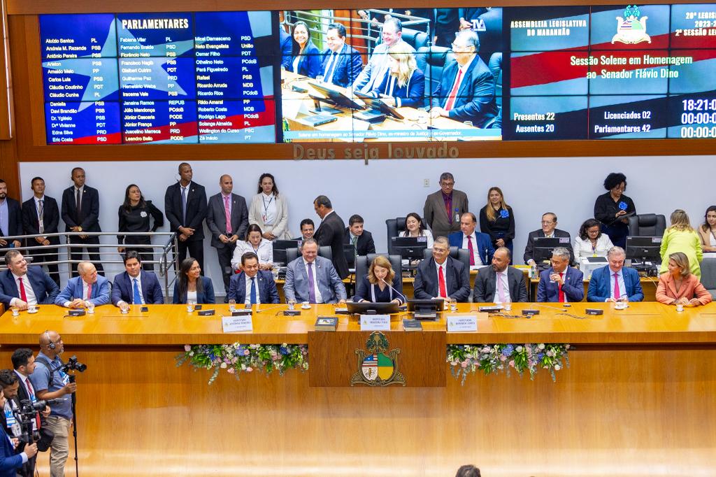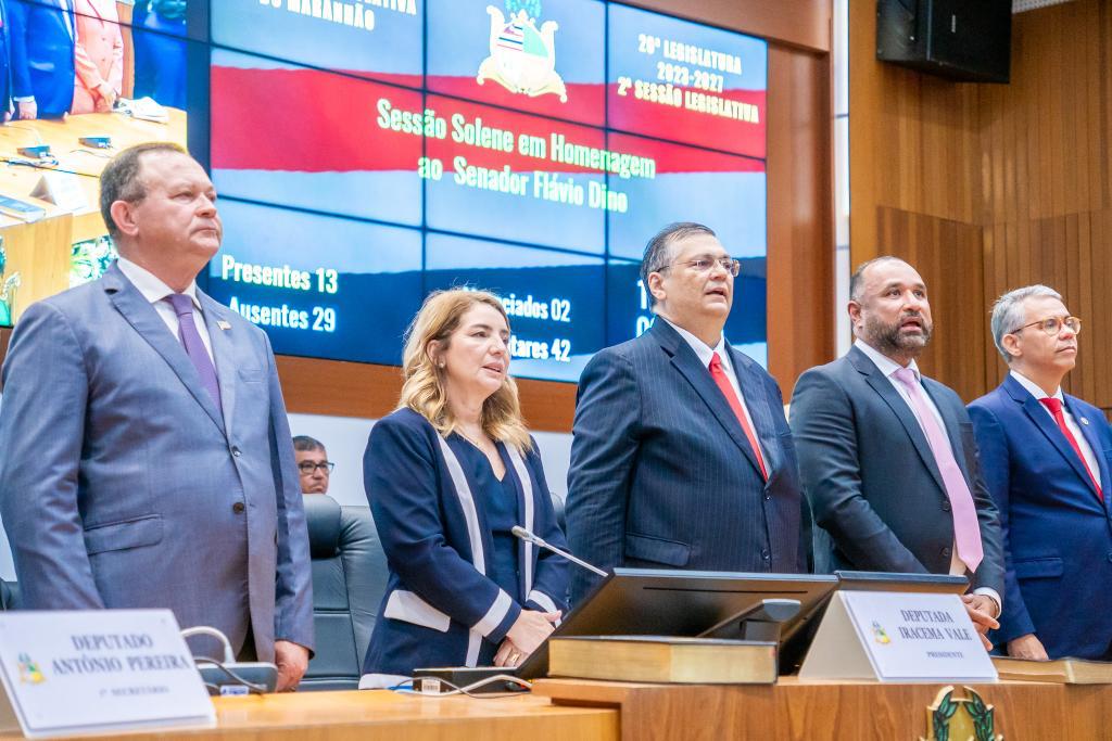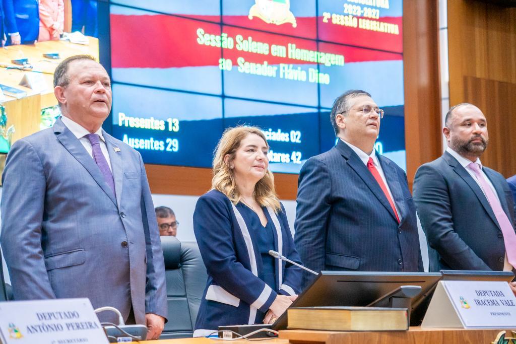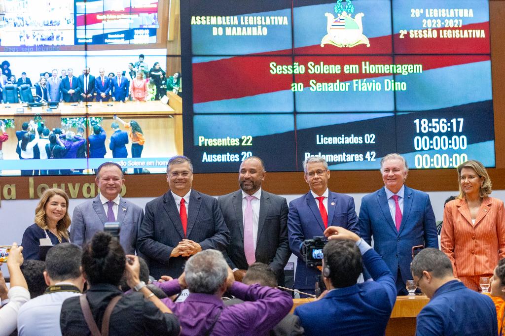 Em sessão solene realizada na tarde desta sexta-feira (2), a Assembleia Legislativa do Maranhão, por iniciativa do deputado Rodrigo Lago (PcdoB), homenageou o senador Flávio Dino, ex-governador, ex-ministro da Justiça e ministro nomeado do Supremo Tribunal Federal (STF). A proposição da homenagem foi subscrita pelos deputados Júlio Mendonça (PCdoB), Othelino Neto (PCdoB), Carlos Lula (PSB) e Leandro Bello (Podemos).