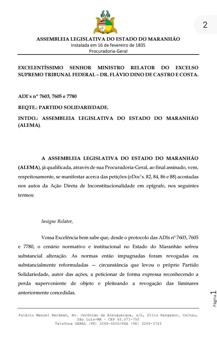 A Assembleia Legislativa do Maranhão protocolou, nesta quarta-feira (2), uma nova manifestação no Supremo Tribunal Federal (STF) dentro do processo da Ação Direta de Inconstitucionalidade (ADI 7605), que trata da escolha de conselheiros para o Tribunal de Contas do Estado do Maranhão (TCE/MA).