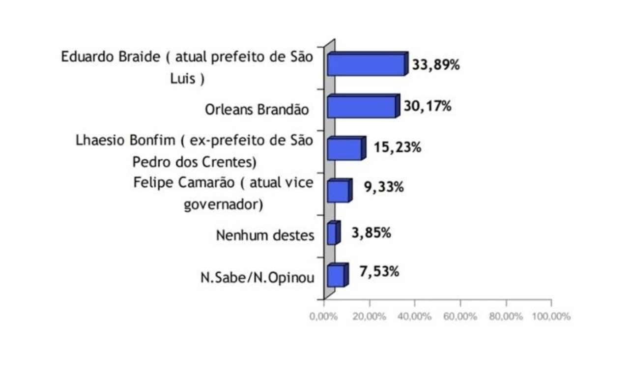 Levantamento do Instituto Nacional de Opinião Pública (Inop Previsão), divulgado nesta terça-feira (12), aponta empate técnico na disputa pelo governo do Maranhão entre o prefeito de São Luís, Eduardo Braide (PSD), com 33,89% das intenções de voto, e o secretário estadual de Assuntos Municipalistas, Orleans Brandão (MDB), que marcou 30,17%.