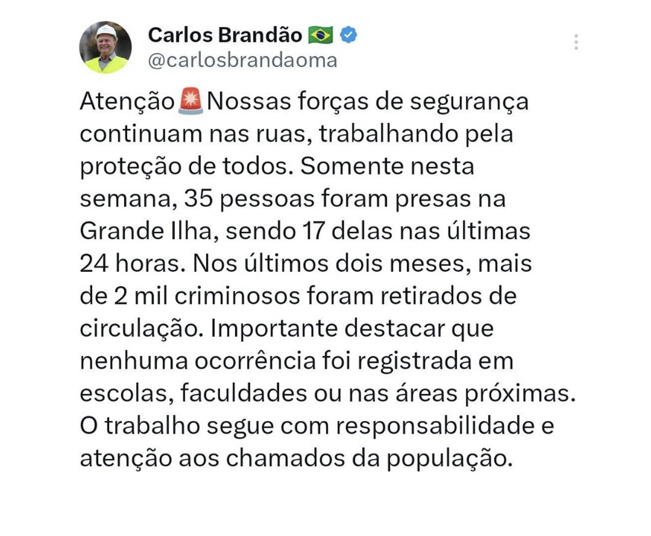 O governador Carlos Brandão anunciou, por meio das redes sociais, o reforço das ações de segurança pública na Grande Ilha e a ampliação do número de prisões realizadas nas últimas semanas. Segundo o chefe do executivo estadual, somente esta semana 35 pessoas foram presas, sendo 17 delas nas últimas 24 horas. Nos últimos dois meses, mais de 2 mil criminosos foram retirados de circulação em todo o Maranhão.