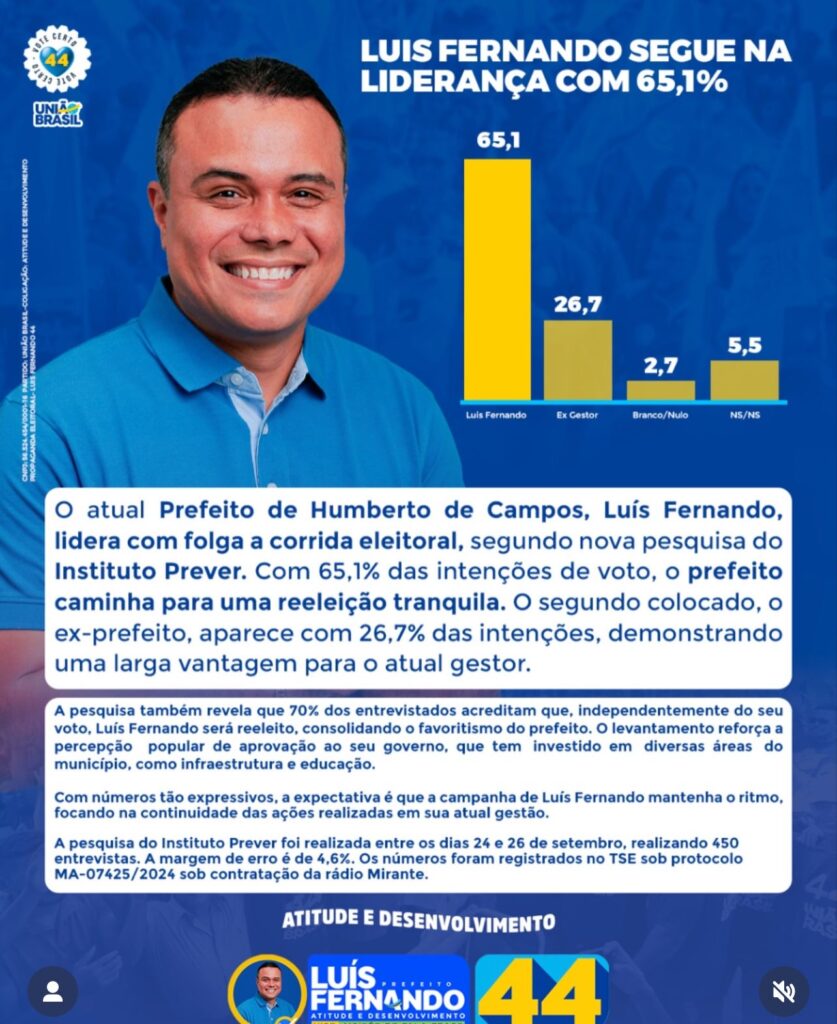 Luís Fernando lidera com folga corrida pela reeleição em Humberto de Campos, aponta pesquisa