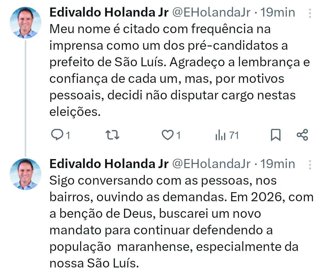 Em postagem nas redes sociais, Edivaldo Holanda Jr. informou que não disputará a eleição de prefeito neste ano.