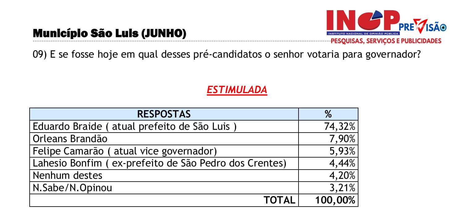 Comparativo dos números de pesquisas feitas em São Luís pelo Instituto Nacional de Opinião Pública (Inop Previsão), nos meses de junho e agosto, mostra crescimento da pré-candidatura de Orleans Brandão (MDB) ao governo do Estado e queda do percentual do pré-candidato Eduardo Braide (PSD). Chama atenção que o declínio do prefeito de São Luís ocorre justamente após anúncio da aproximação dele com o grupo de dinistas de extrema esquerda comunista.