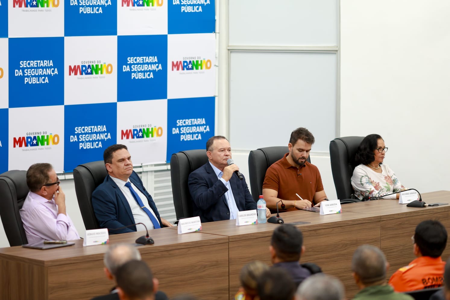 Além do governador, do secretário da Segurança Pública, Maurício Martins, do delegado-geral da Polícia Civil, Manoel Almeida, dos comandantes da Polícia Militar, coronel Wallace Amorim, e do Corpo de Bombeiros, coronel Célio Roberto, do diretor do Centro Tático Aéreo, coronel Magno, e da perita-geral do Estado, Anne Kelly Bastos, também estiveram presentes representantes da Delegacia da Mulher, da Inteligência, da Força Estadual, do Centro Integrado de Operações de Segurança, superintendentes de polícia, entre outros. Participaram da reunião, ainda, os secretários de Cultura, Yuri Arruda; de Turismo, Socorro Araújo; e de Comunicação, Sérgio Macedo.