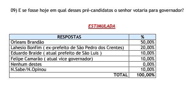 No município de Tuntum, pesquisa para o governo do Estado, realizada pelo Instituto Nacional de Opinião Pública (Inop Previsão), mostra liderança do secretário de Assuntos Municipalistas, Orleans Brandão (MDB), com 50% das intenções de voto.