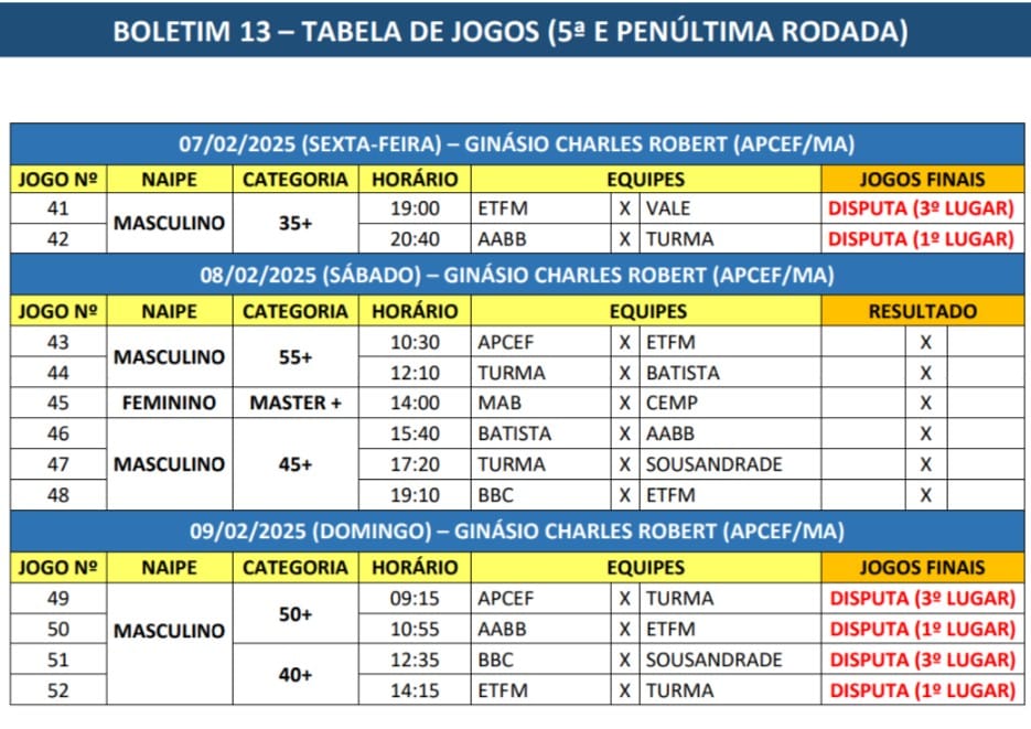 Os jogos acontecem no Ginásio Charles Robert na sede social da APCEF (Calhau).