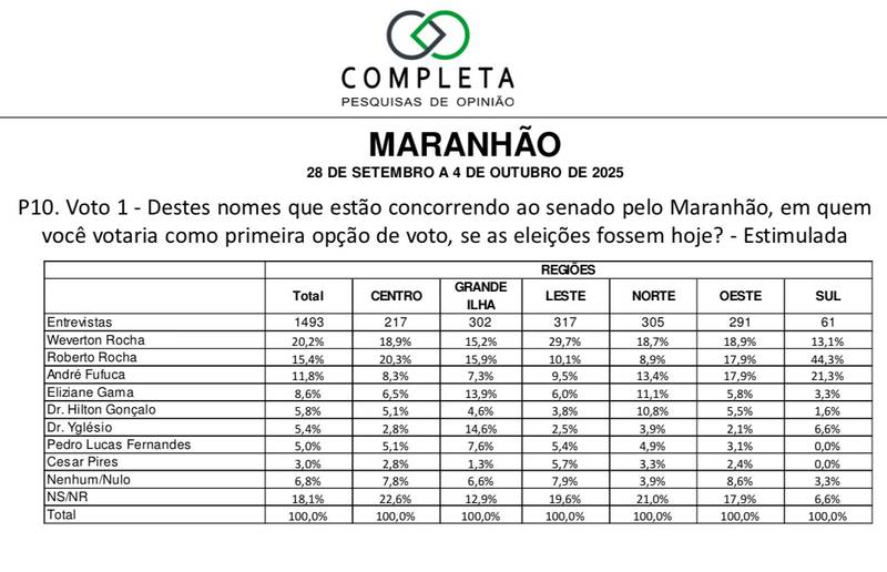 • Weverton Rocha lidera disputa pelo Senado no Maranhão com 20,2% das intenções de voto, aponta pesquisa estimulada